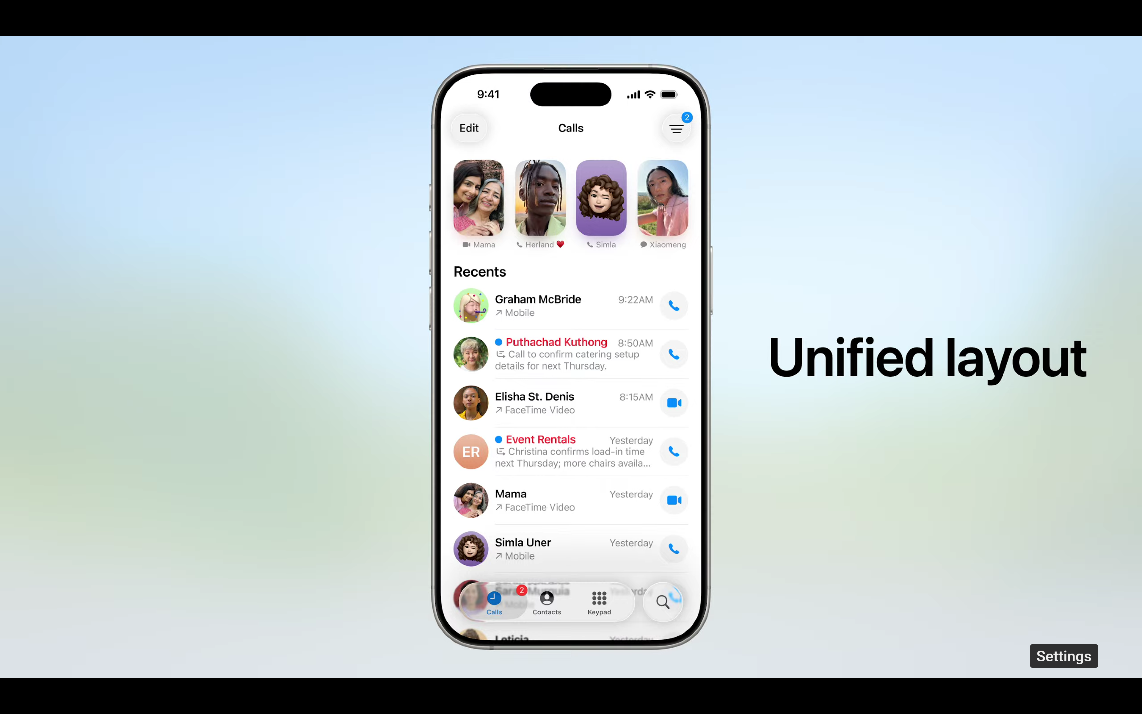 اپل طراحی این بخش را به طوری تغییر داده تا همه چیز حتی راحتتر از قبل پیش روی کاربر قرار بگیرد و حتی لازم نباشد برای لحظهای به دنبال کاربر مورد نظر بگردید. کاربران مورد علاقه در بالای این برنامه با اندازه بزرگتر قرار میگیرند و در پایین نیز لیست تماسهای اخیر دیده میشود.